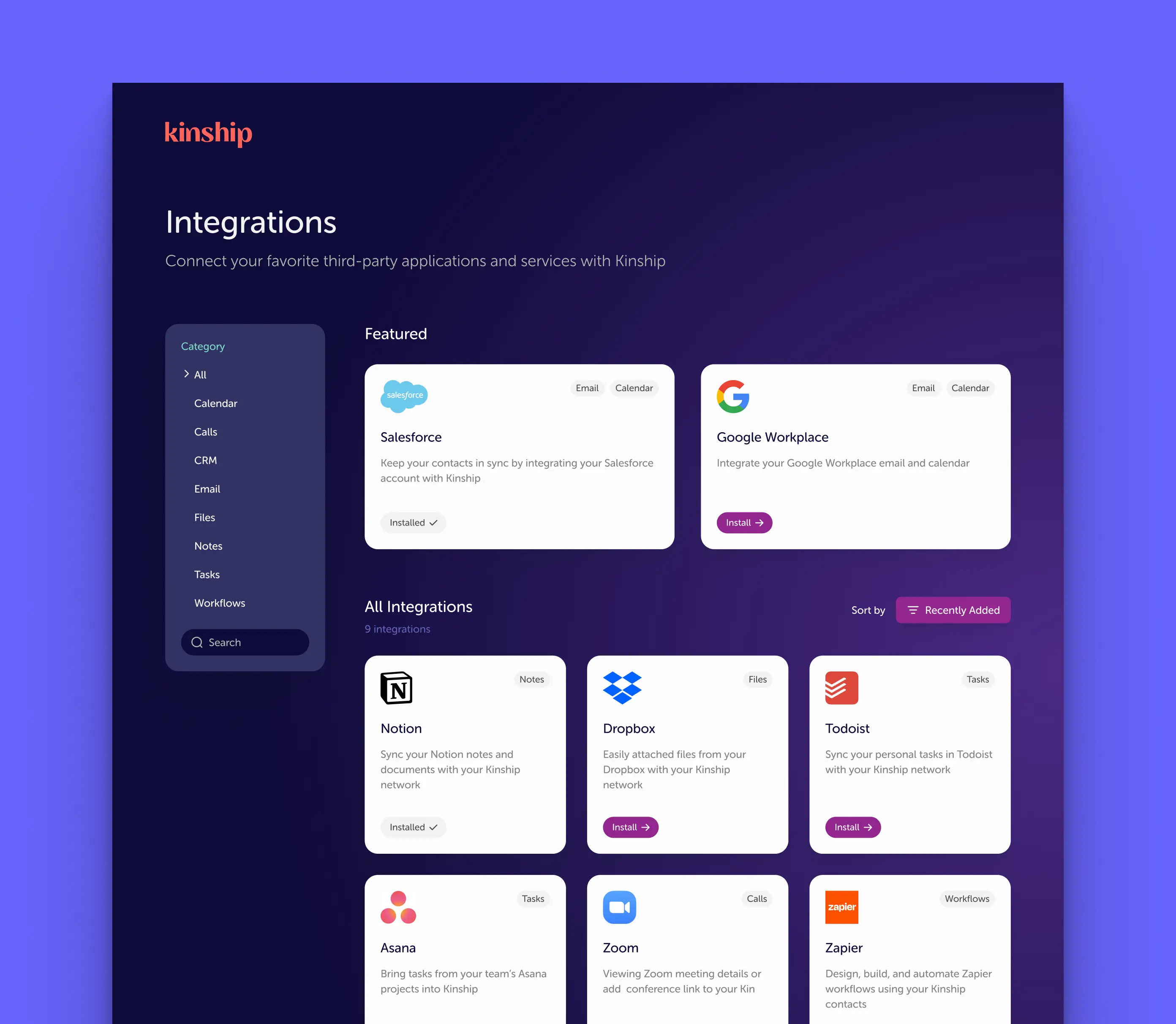 We focused on clarity, warmth, and momentum, and designed a system that surfaces meaningful moments, tracks engagement, and nudges users to take action. Alongside the mobile redesign, we also introduced a clean new integrations hub, helping Kinship plug into the productivity tools their users already rely on.